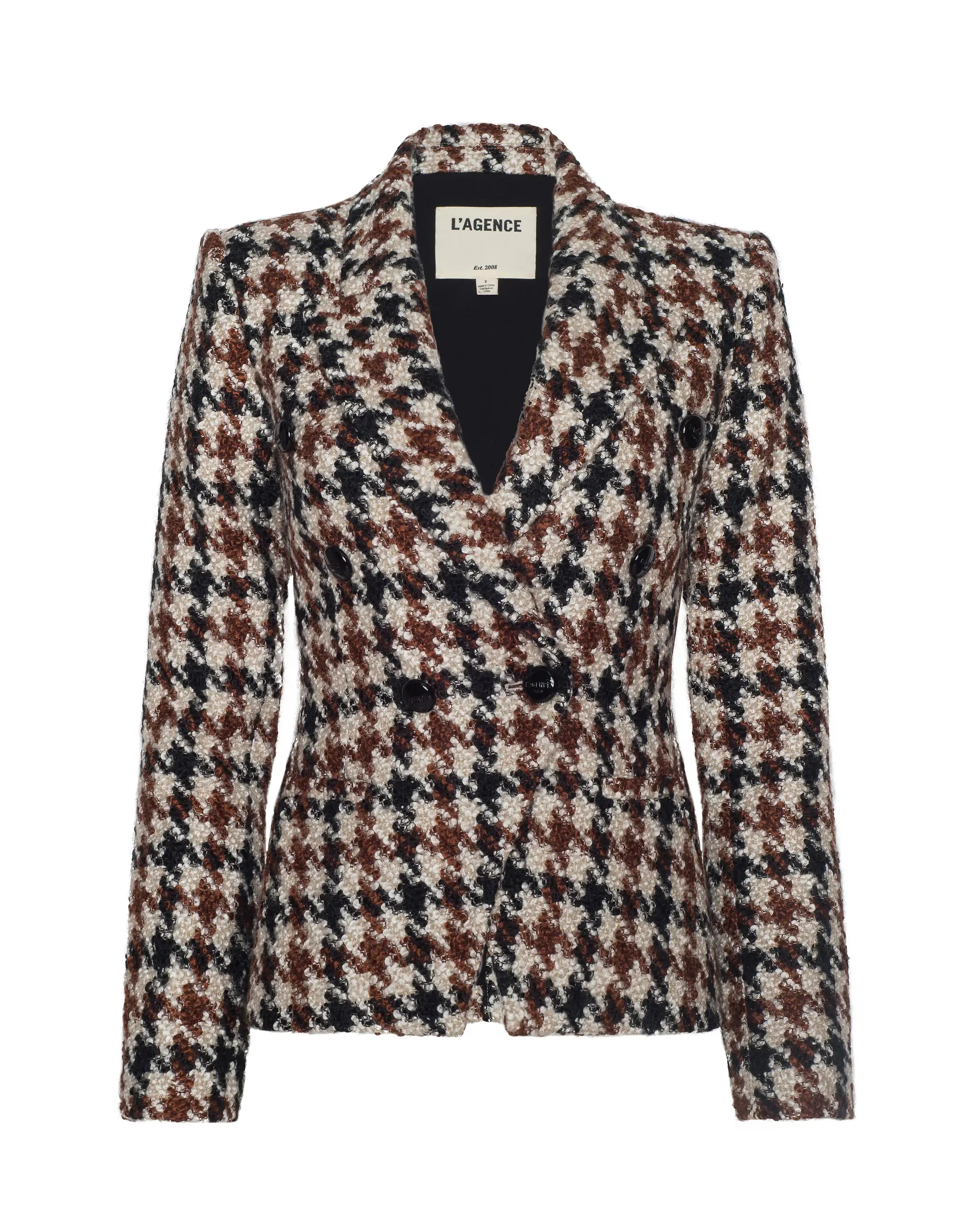 An ultra flattering double-breasted blazer featuring a defined, cinched waist. Now in a bold, oversized boucle houndstooth.• Wool-blend houndstooth tweed• Lined• Shoulder pads• Welt pockets• Button closures