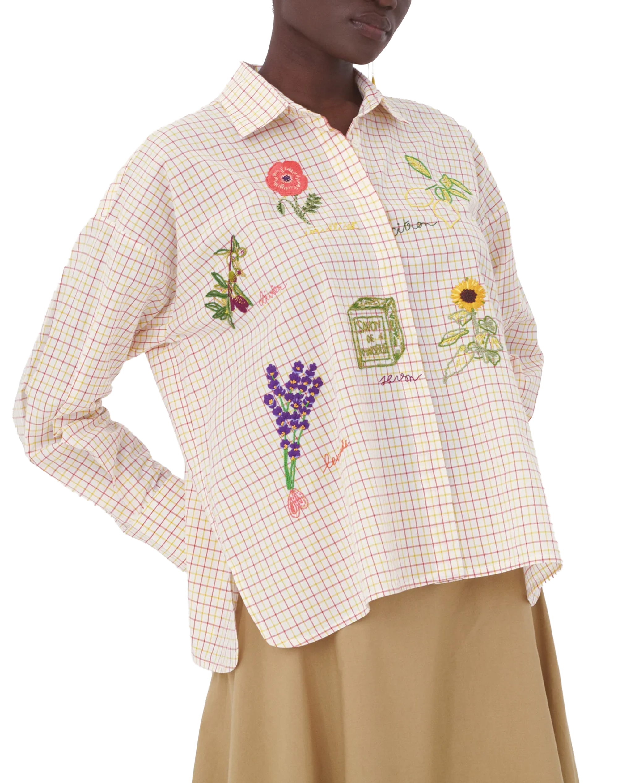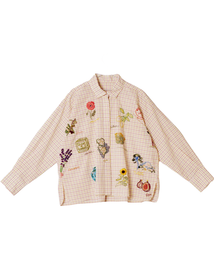 This Greta shirt is adorned with the emblematic symbols of Provence: Marseille soap, olive trees, lemons, lavender… So many sunny winks hand-embroidered on a checkered cotton poplin.